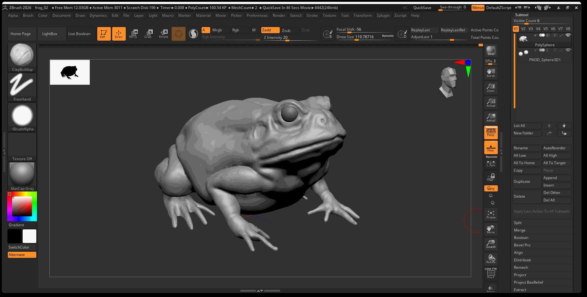 Once finished projecting our model, we can begin to sculpt more secondary and tertiary forms on our model. During this phase of sculpting, looking closely at the variety of details on your model. Use your subdivision to your advantage. For large details, use a lower level of subdivision. For small resolution details, use a lower level of subdivision.
