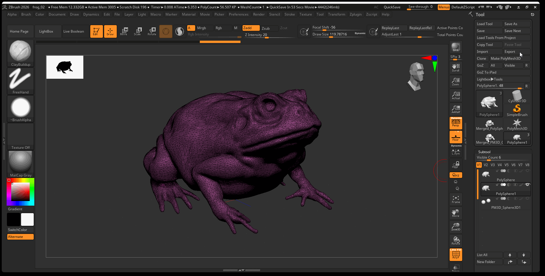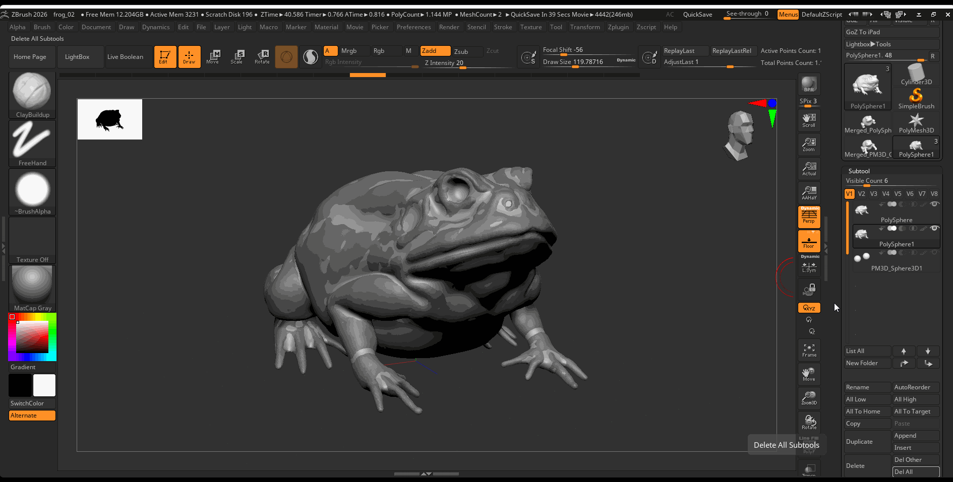 - With your low poly model selected and it set to its highest level of subdivision , navigate to Subtools > Project
