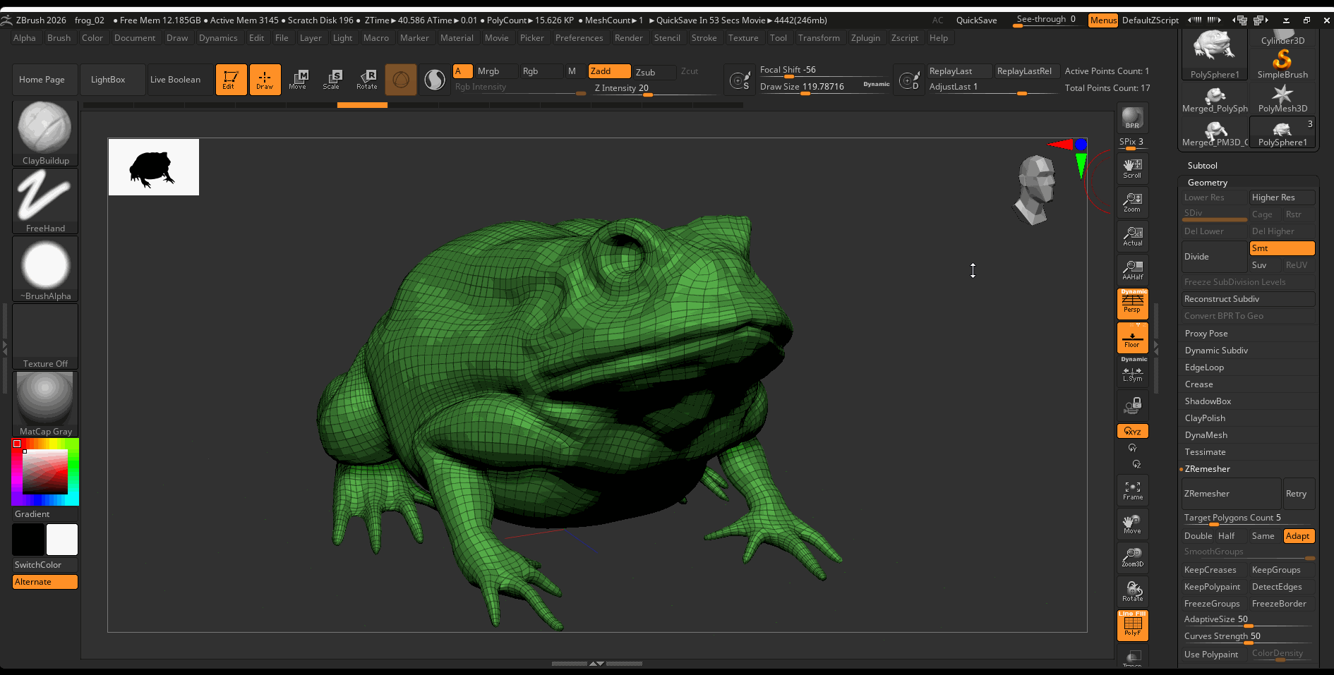 Ideally your remeshed model should be low enough to preserve all the major details of your high resolution model while having a poly count of around 10k to 30k polygons. You can adjust the amount of topology created from the ZRemesher by adjusting the Target Polygons Count. 5 is typically a good number, but if you want less topology you might move this value to 2 and might increase it to 7 if you want more geometry.