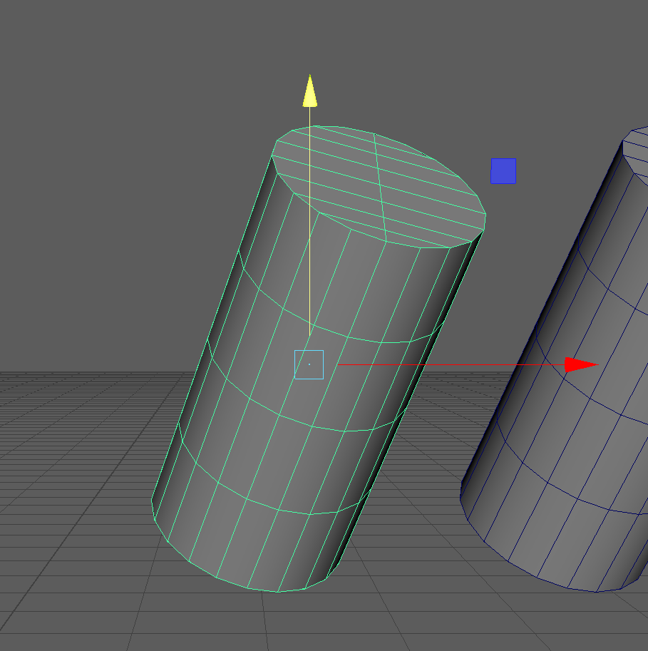 Notice that when we combine our cylinder, our Object Space transform matches our world coordinates. The Combine tool freezes our transformations, in other words, sets all of our channel box values to 0. Our object now has a rotation of 0, so the object space gizmo now matches perfectly with world space.