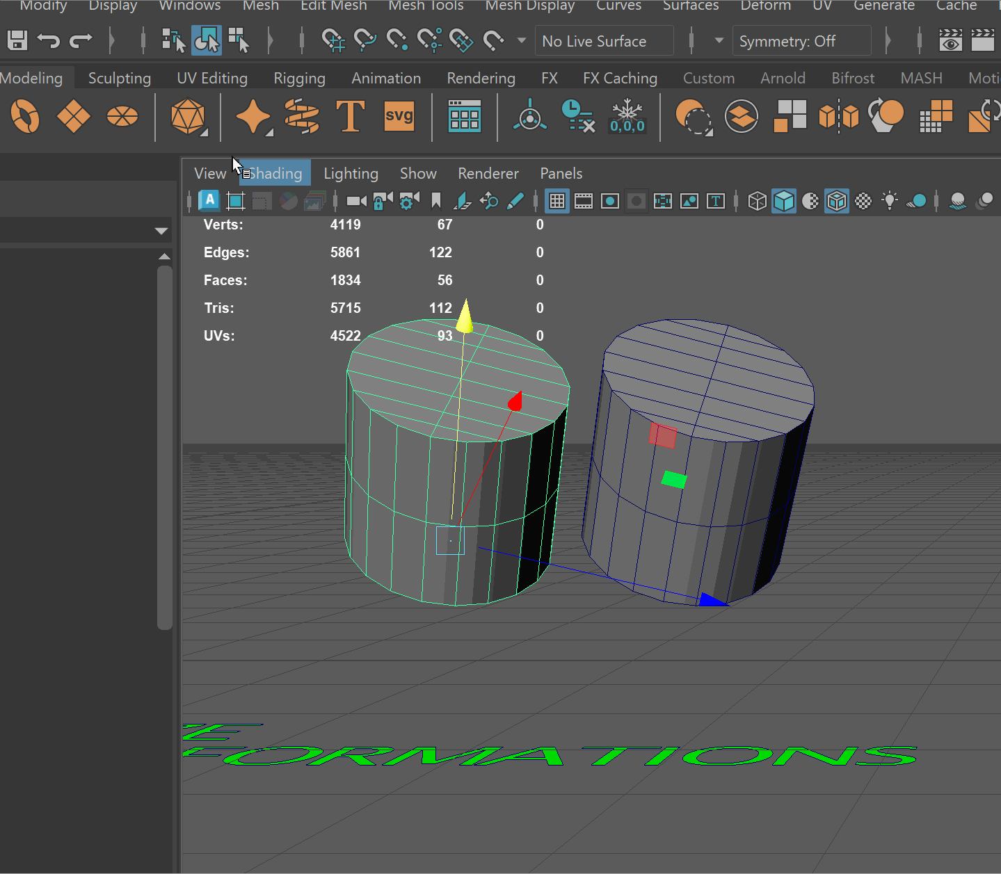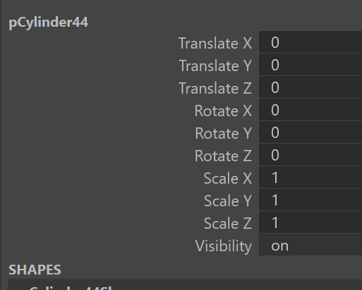 We can manually freeze the transformation on an object by navigating to the Freeze Transformation tool. Select the first cylinder in the "Freeze Transformation" section then navigate to Display -> Freeze Transformations. Notice how the Channel Box values reset to 0.