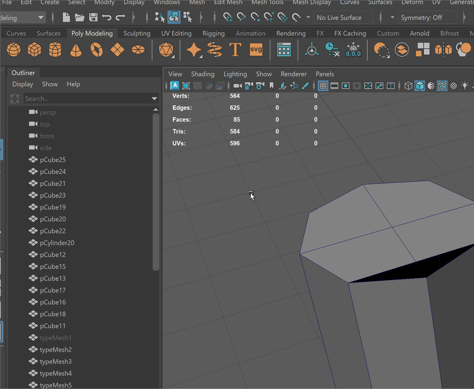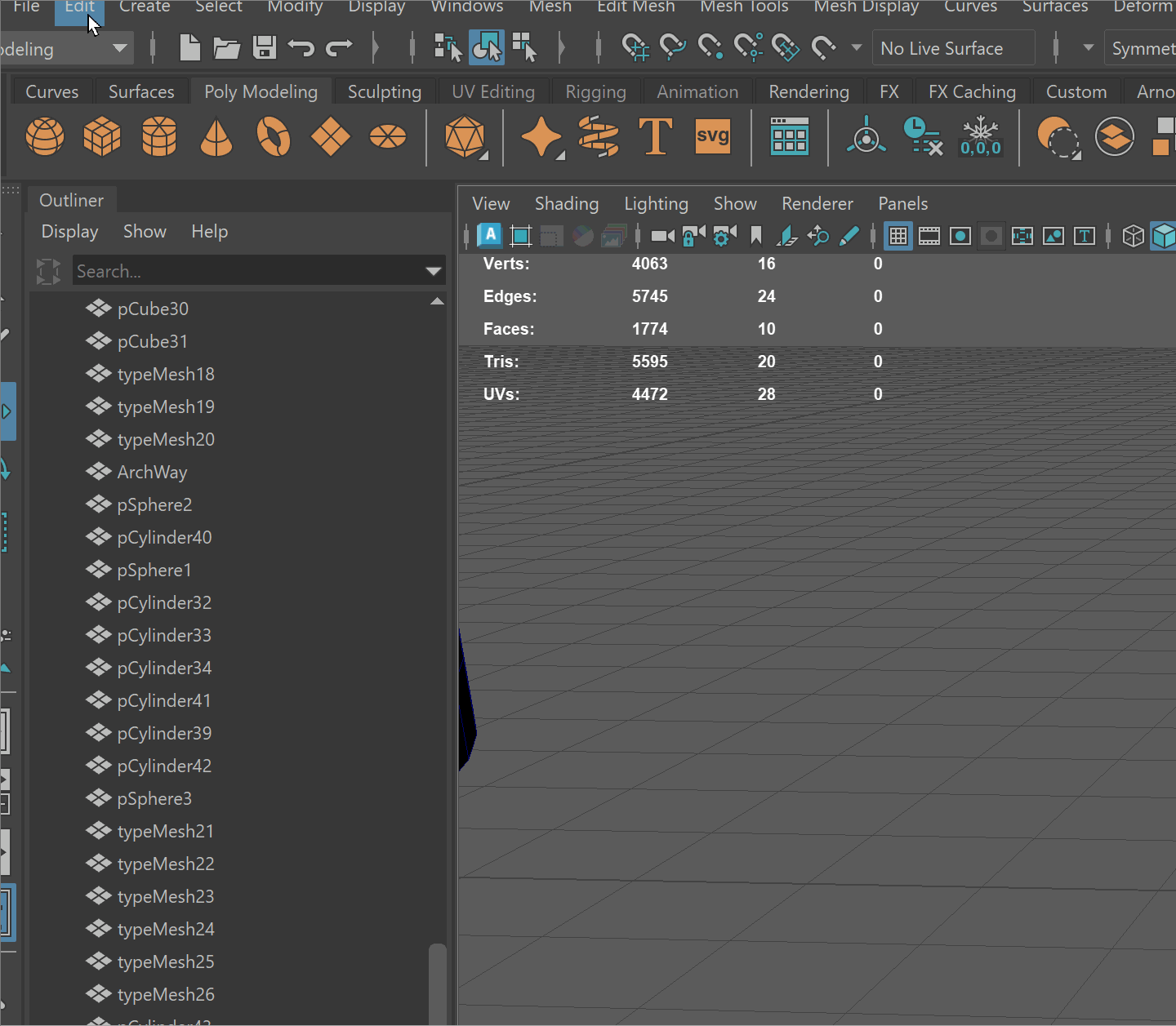 - Let's keep track of the sub components in our scene by using Poly Count. Navigate to Display -> Heads Up Display -> Poly Count. This shows us how many Vertices, Edges, and Faces there are in our scene.