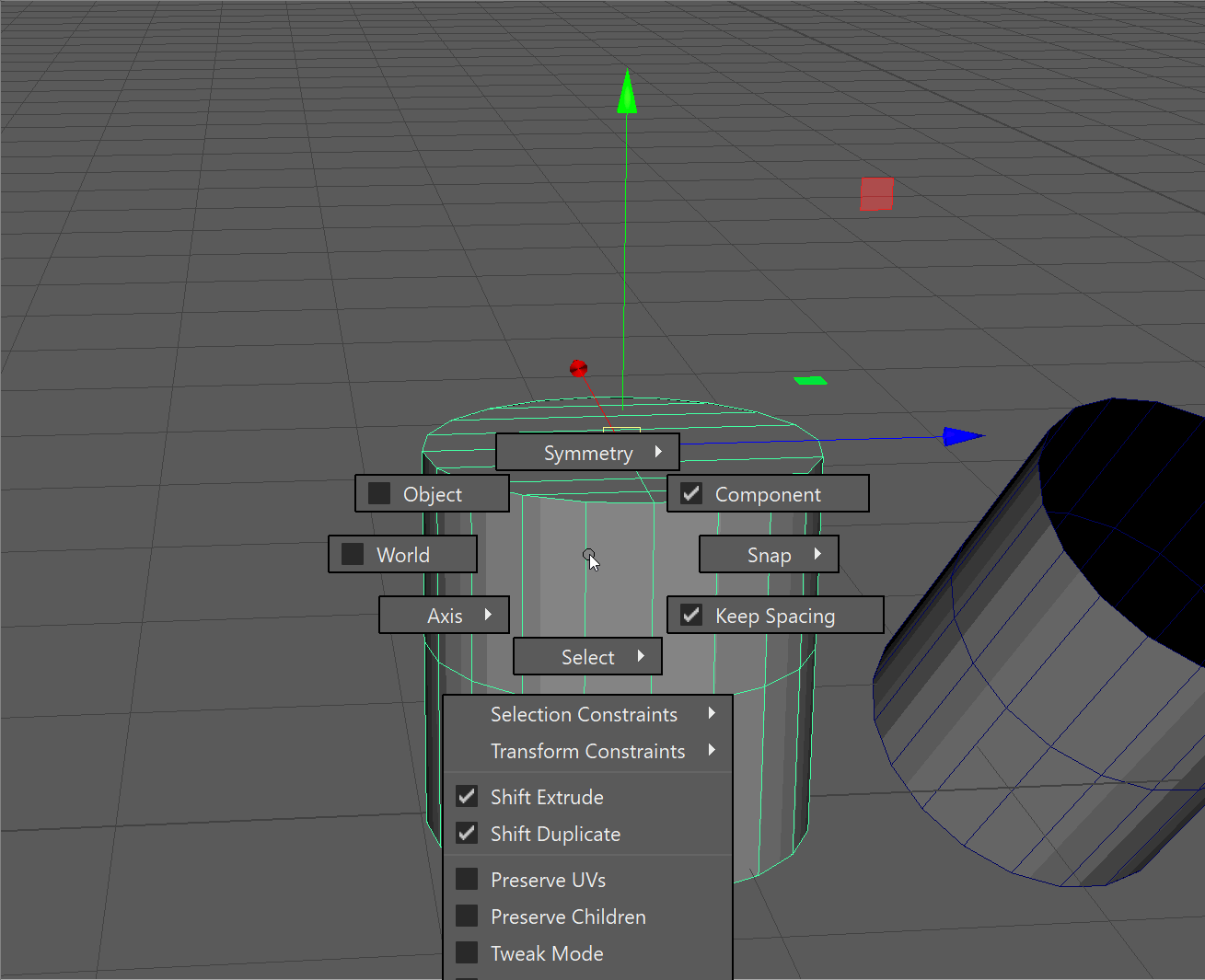 We can open the extrude tool by using the Shift+RightClick marking menu and then navigating to Extrude Face.