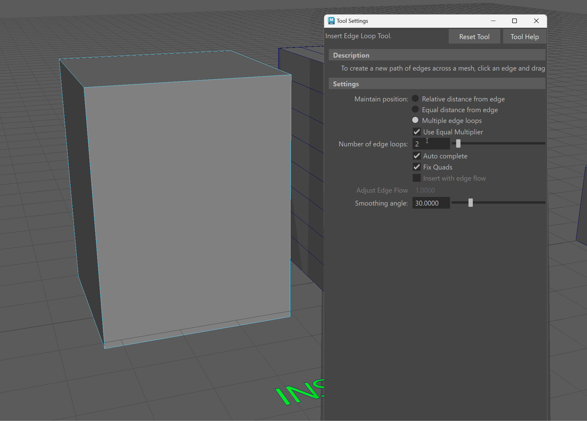 Let's start by opening the Insert Edge Loop Tool Settings. Hold Shift+RMB over the model and navigate to the small box next to the Insert Edge Loop Tool. This will bring up the tools settings.