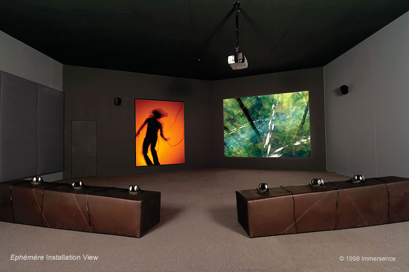 "During public installations of Ephémère, immersion takes place in a private chamber facing a large darkened space where museum visitors can witness the immersive performances as they take place in real time: aurally, as sound is generated by the participant’s behaviour within the work; and visually, as imagery generated from the immersant’s point-of-view is projected in real time onto a large-scale video screen. The shadow-silhouette of the immersant is projected live onto another screen, emphasizing the relationship between bodily presence and the immersive experience."
