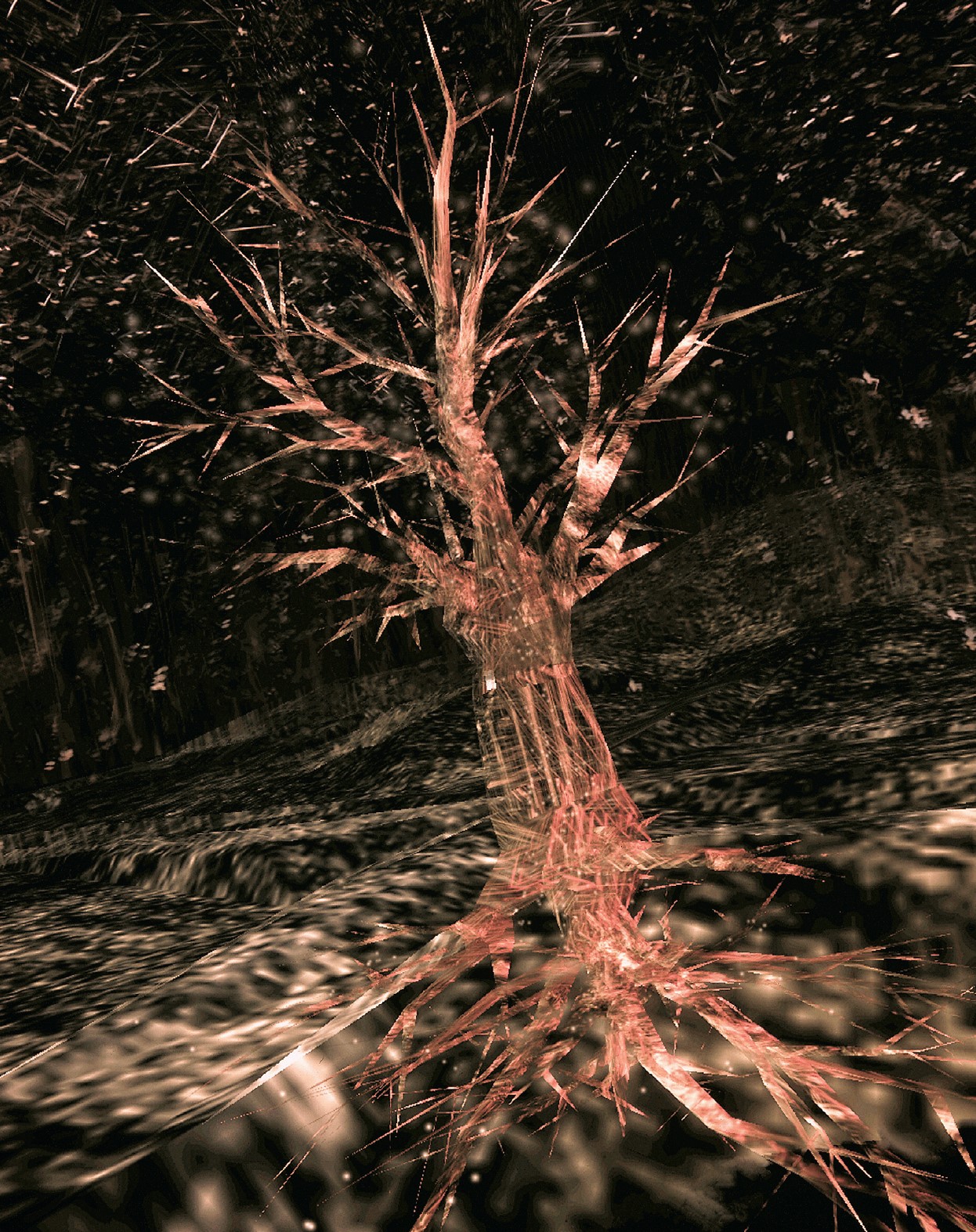 "Immersion in Osmose begins with the donning of the head-mounted display and motion-tracking vest. The first virtual space encountered is a three-dimensional Cartesian Grid which functions as an orientation space. With the immersant's first breaths, the grid gives way to a clearing in a forest. There are a dozen world-spaces in Osmose, most based on metaphorical aspects of nature. These include Clearing, Forest, Tree, Leaf, Cloud, Pond, Subterranean Earth, and Abyss. There is also a substratum, Code, which contains much of the actual software used to create the work, and a superstratum, Text, a space consisting of quotes from the artist and excerpts of relevant texts on technology, the body and nature. Code and Text function as conceptual parentheses around the worlds within."