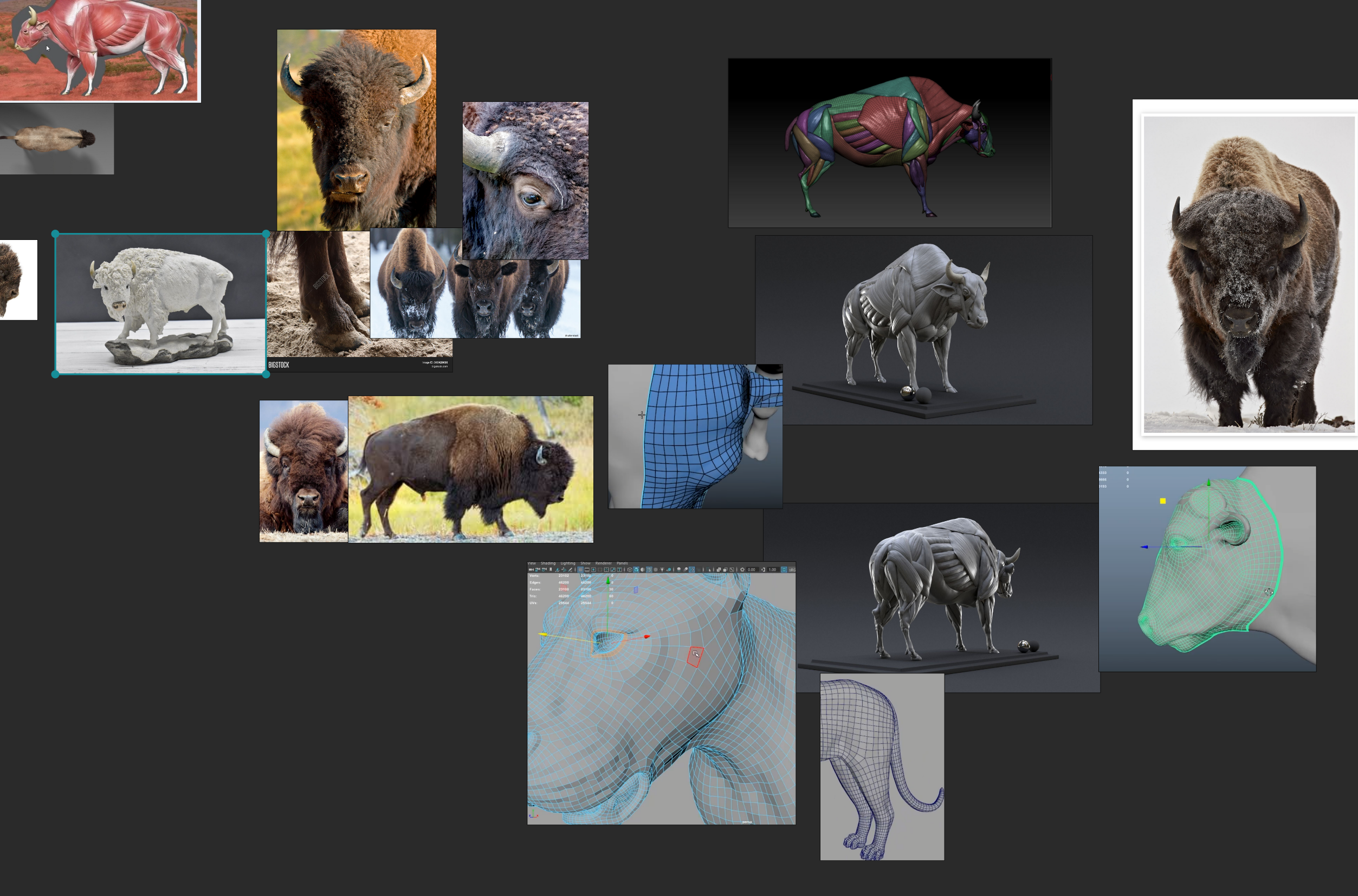 Here is an example of a part of reference board that I used when sculpting a character for one of my games: