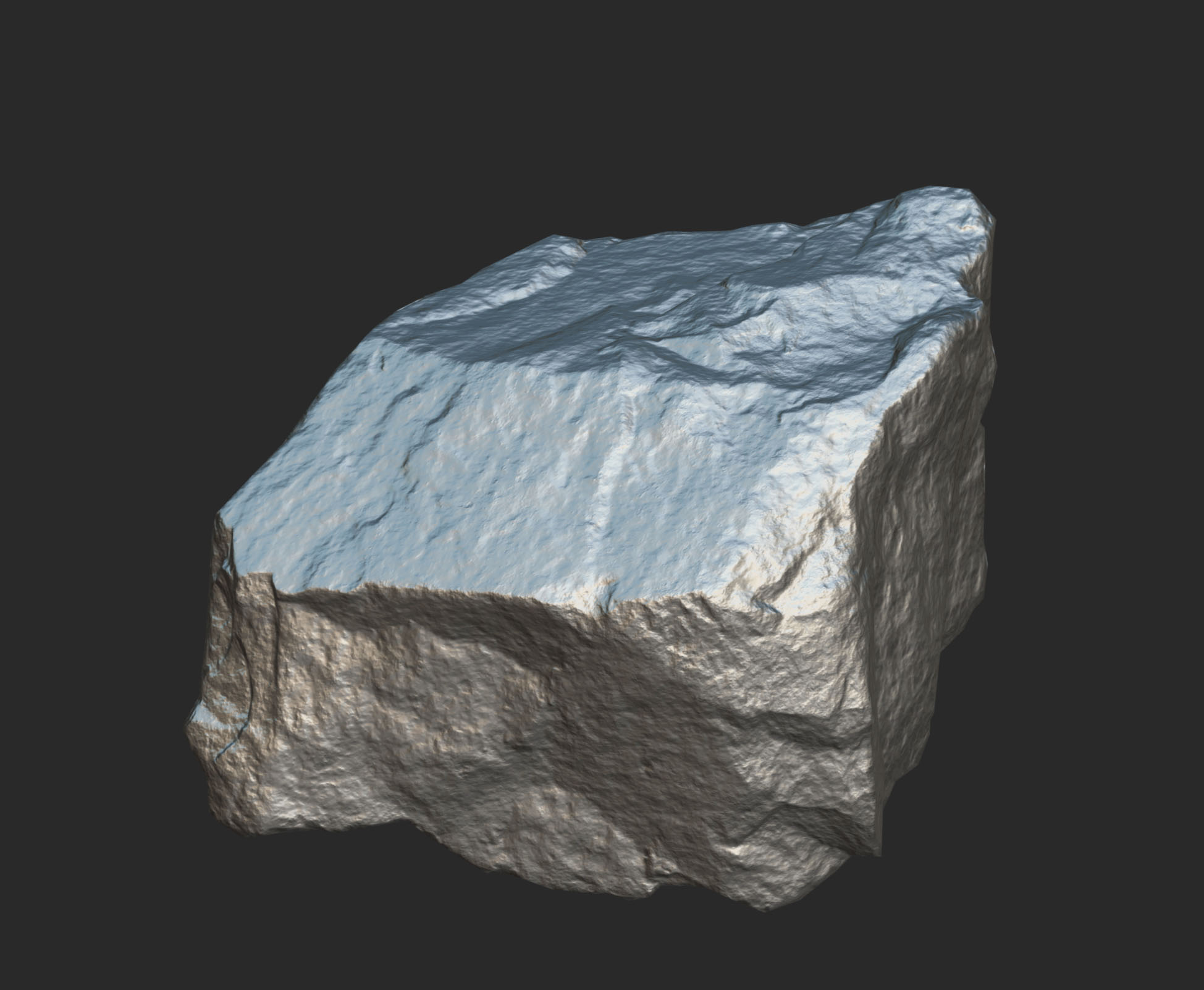 Using a mix of Trim Dynamic, Clay Buildup, Move, and Masking begin to add in larger tertiary forms and smaller details. Resist the urge to subdivide, and add in all the details you can with the 128 Dynamesh Resolution. Look at the divots and edges of your rock references. Puzzle over what physical forces made those divots. Tertiary forms and detail add story - what events led for your rock to look this way? Did a child take a hammer and smash the rock in half? Has this rock been kicked around a city for decades? Look at your references closely and use your imagination to conjure a story with your rock through sculpting.