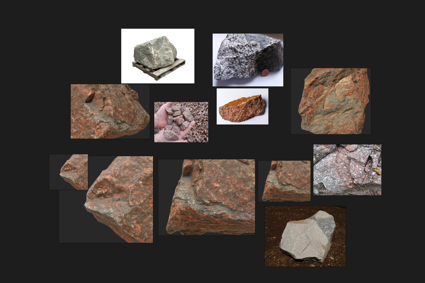 When collecting reference images, it is often best to look beyond Google Images to find more interesting and detailed images. Sketchfab is a great resource for looking for reference as many 3D artists will upload 3D scans of objects that they gather in the world. These references not only make for great images as screenshots, but are also great references for form and structure. Other great resources include photo catalogs in the library, as well as online photo sites such as Flickr. You can even take your own photos for resources! Rocks are particular, examine where the rock you are observing is found. This collection by the artist Kanistra is a great place to start.